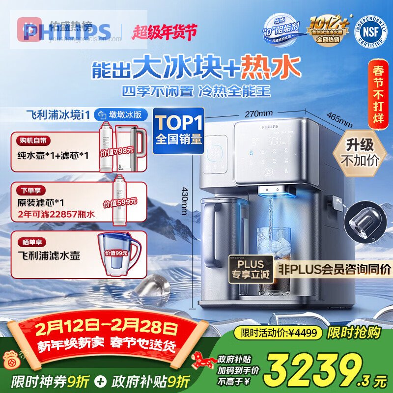 飞利浦(PHILIPS)大冰块净水器冰境i1墩墩冰版家用台式即热免安装净饮机加热直饮净水 净水器加热直饮一体机ADD8604¥