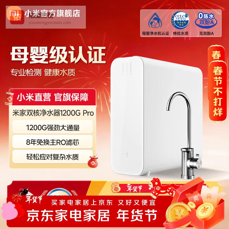 3、米家净水器Pro 1200G这款净水器拥有双出水设计,能分开提供纯净母婴水与深度过滤的生活用水,避免交叉污染,既安全又健康。配备双水路系统,让净水与生活用水彼此隔离,确保每一滴水都达到安全标准。用户体验中,最大的亮点是高效的深度净化功能,采用进口RO膜,能去除水垢、重金属和细菌,让水质更纯净。