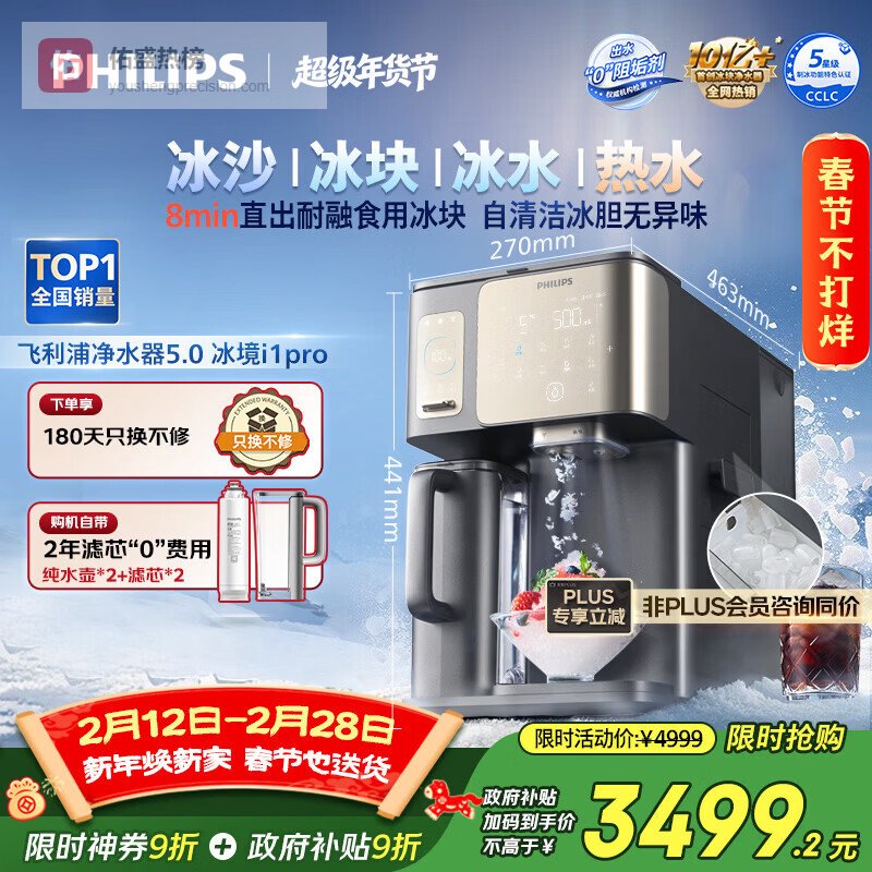 飞利浦(PHILIPS)冰沙冰块加热净水器家用冰境i1pro 台式免安装净饮机 冷热一体净水机ADD8608¥