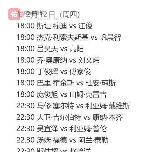 根据赛程安排,2月12日下午六点这个时段将成为“中国日”,除了丁俊晖对阵傅家俊这场焦点战,庞俊旭、江俊等多达8名中国选手将同时出击。 他们的表现将决定中国军团在正赛64强中最终能占据多少席位。 晚间十点半,还有白雨露、吴宜泽、斯佳辉等4名中国选手登场。