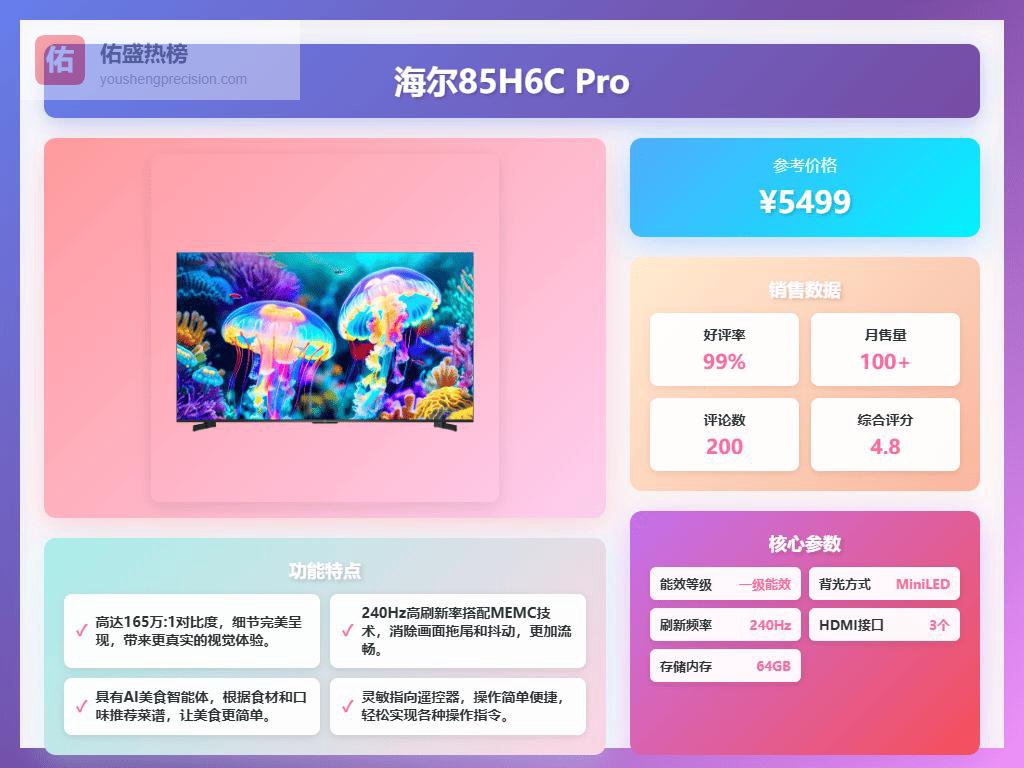 2、海尔85H6C Pro这款平板电视配备了Mini LED背光技术,屏幕分为300到400个独立背光区,能够精准控制亮暗区域,实现更深邃的黑色和细腻的画面层次。支持4K HDR,画面色彩自然平滑,确保每一帧都能还原真实细节。加上1000nits的峰值亮度,即使在强光环境下也能清晰观看,亮度表现令人满意。