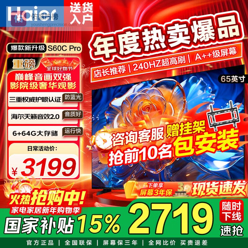 海尔(Haier)电视新品S60C系列 4K高清护眼 6+64GB大内存 全通道240Hz高刷高色域 WiFi6智能超薄彩电 65英寸 240Hz/6+64G/AI智能模型¥