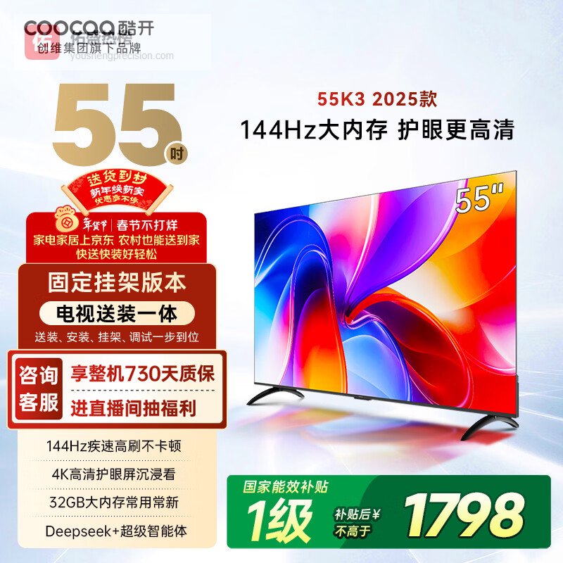 酷开创维55K3 2025款【送装一体】一级能效 32GB 144Hz AI远场语音 国家补贴 液晶平板电视机55P3F-J¥