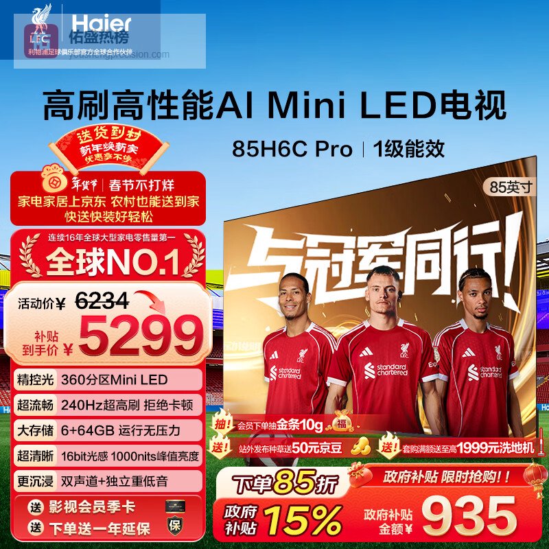 海尔(Haier)电视 85H6C Pro 85英寸 MiniLED 360分区 240Hz高刷游戏 6+64G AI智能 护眼 国家补贴一级能效¥
