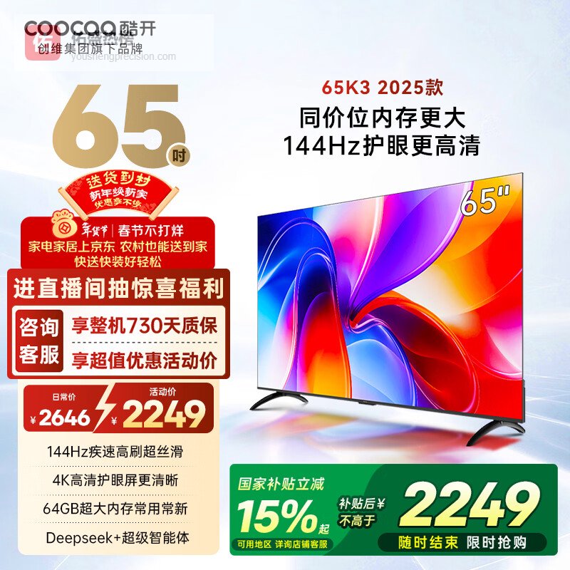 酷开创维K3 2025款 65英寸平板智慧屏 一级能效 64GB大内存 144Hz电视剧远场语音 液晶游戏电视机65P3F¥