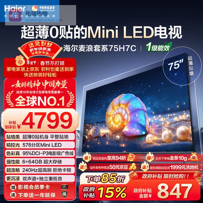 3、海尔75H7C这款海尔75H7C平板电视采用了Mini LED背光技术,配备576个分区控光,能精准调节屏幕亮度,呈现更丰富的层次感。无论是暗部的细节表现还是亮部的高光细节,都能清晰展现,画面深邃细腻。而且高亮度达到了1300尼特,即使在白天强光环境下,也能保持画面明亮真实,带来沉浸式的视觉体验。