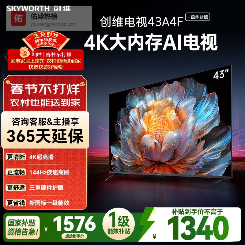 4、创维43A4FD这款创维(Skyworth)43A4FD平板电视配备超高清4K分辨率,能够还原细腻的画面细节和丰富的色彩表现,让画质更加清晰自然。支持144Hz高刷新率,在观看高速运动场景或游戏时,画面更加流畅,减少拖影和卡顿,提升视觉体验。