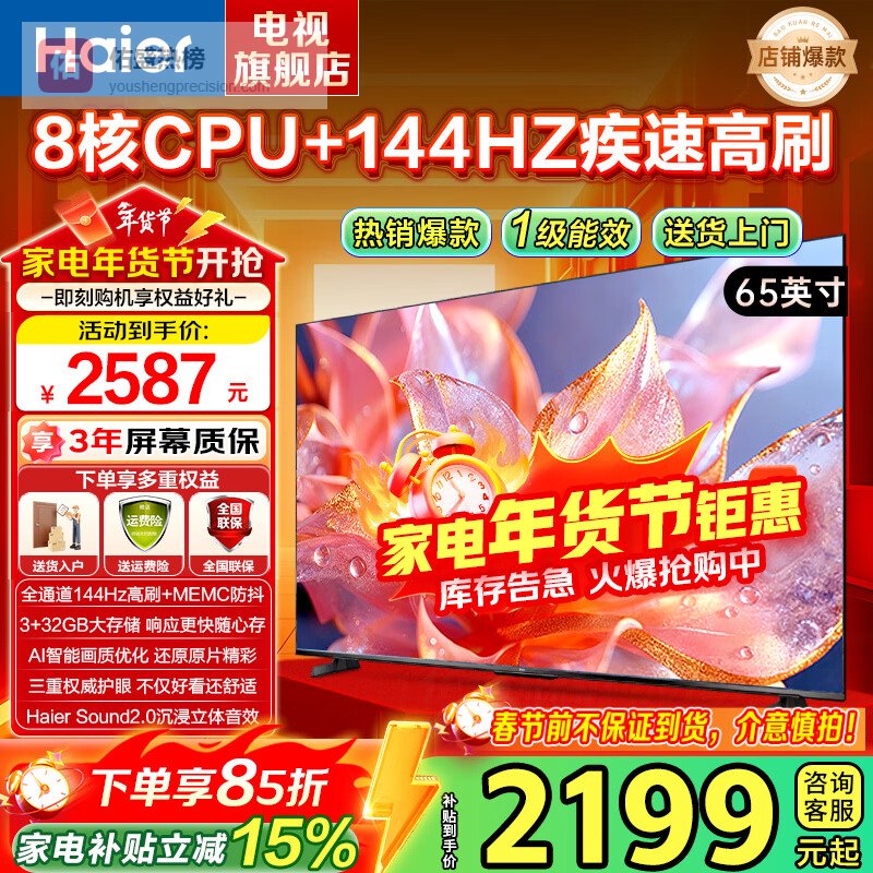 海尔(Haier)电视 语音控制4K超高清H5C 144HZ高刷护眼全面屏智能超薄液晶彩电智慧屏一级能效 家用平板电视机 65英寸 【新品 一级能效】3+32G/144Hz高刷¥