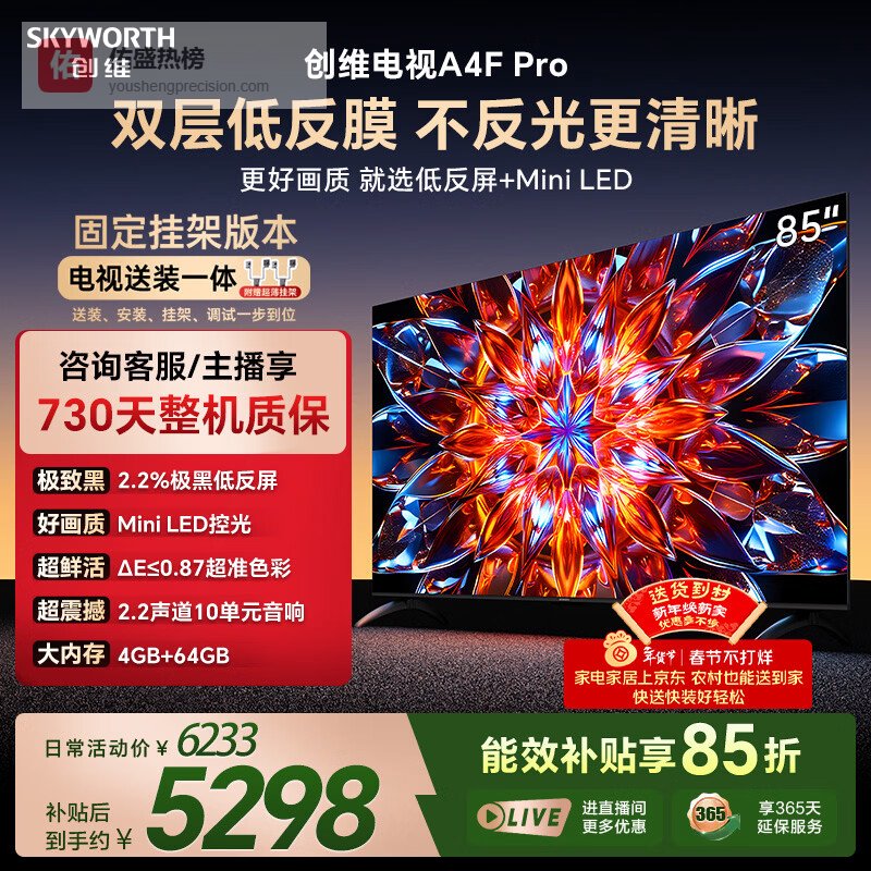 2、创维85A4F Pro这款创维A4F Pro 85英寸电视配备了Mini LED背光技术,具有独立分区控光功能,让画面亮暗细节更加丰富,色彩也更加鲜活。此外,采用了极黑低反屏设计,能有效实现高对比度和抗光能力,确保在不同环境下都能呈现清晰细腻的画面表现。其色彩表现经过专业校准,达到△E≤0.87的色准标准,让每一帧画面都逼真自然,提升观影体验。