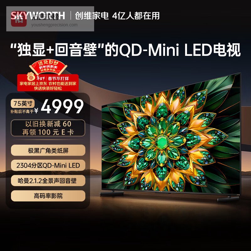 5、创维75A6F Pro这款75英寸的创维平板电视,配备了2304分区QD-Mini LED技术,能够实现像素级的精准控光,带来丰富的层次感和细节表现。其极黑广角类纸屏采用双层纳米低反射材料,有效减少反光,即使在强光环境下也能清晰观看。全视角设计确保画面在任何角度都不会偏色,让观影体验更加自然流畅。