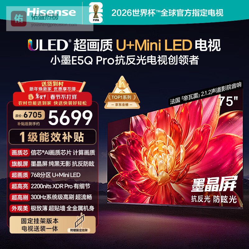 【京东自营】海信电视小墨E5QPro75英寸【送装一体-固定挂架】768分区U+MiniLED信芯芯¥