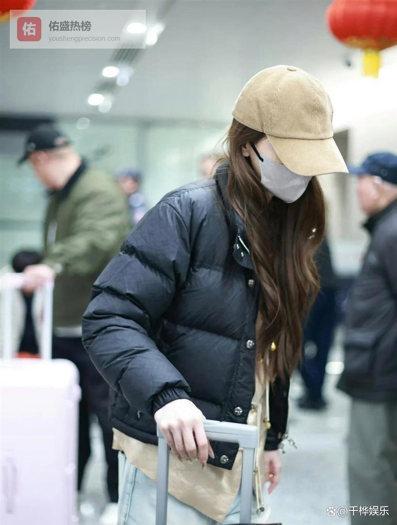 腊月二十六的上海浦东机场,人潮比春运的火车票还难抢。就在这片喧嚣里,一个推着两个巨大行李箱的瘦削身影,几乎没引起任何骚动。她全身裹在黑色新中式羽绒服里,素着一张脸,眼罩和口罩把五官遮得严严实实,下半身一条宽松牛仔裤空荡荡的。