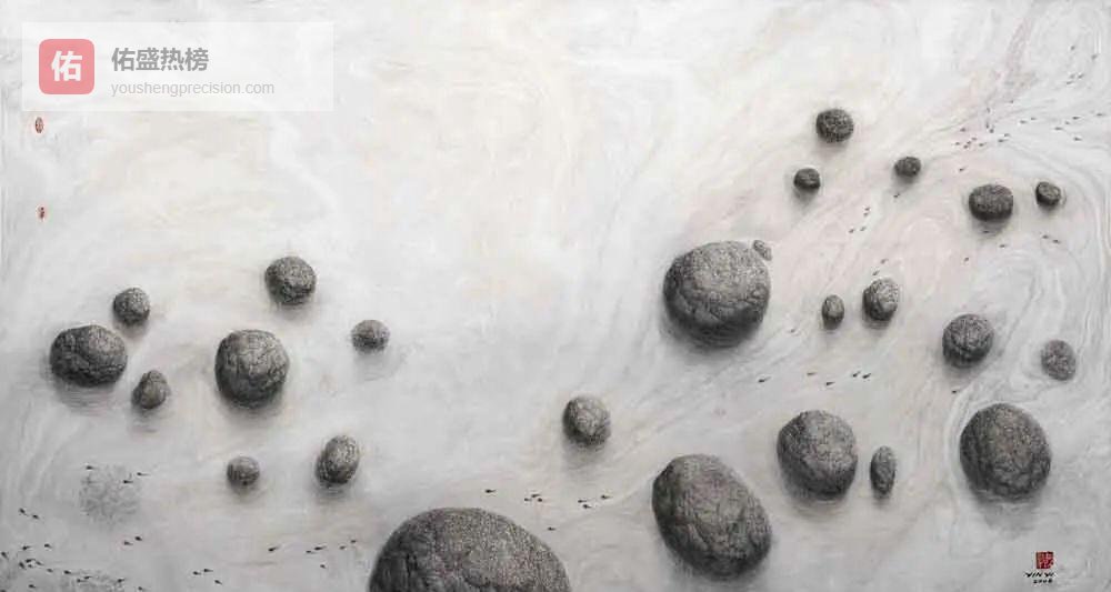 此次展出的《富春山居》再创系列全长17.4米,是尹毅给黄公望的“千年留言”。他先用高拍仪扫描原作每一毫米,再把数据导入3D建模软件,让山形在电脑里“走”过四季二十四时。最终呈现的卷轴不是复制,而是把原作的骨骼重新敷色:雨雪云雾被合成树脂“刻”进肌理,古木舟楫被纳米颜料“镀”上金属光泽。观众站在画前,仿佛看见同一条江面在不同时代的倒影重叠。