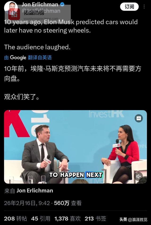 十年前全场哄堂大笑,如今马斯克用量产表,狠狠扇了世界一耳光