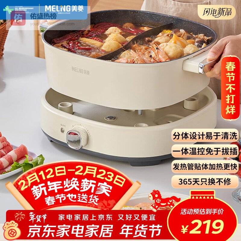 美菱(MeiLing)鸳鸯电火锅家用火锅专用锅分体6.5L多功能锅涮肉锅多用途料理锅下沉式蓄热3分钟速沸涮烤一体电锅¥