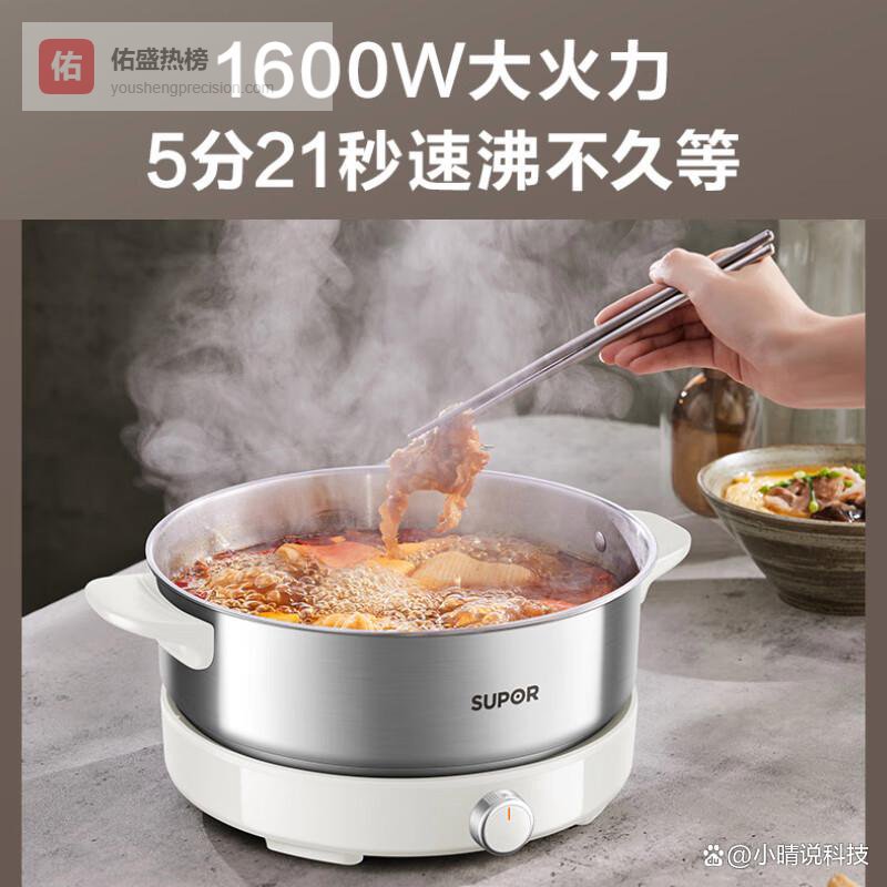 二、苏泊尔1️⃣ 超薄设计:锅体底部厚度只有55mm,比普通电火锅都要薄很多,大大方便夹菜和收纳。不用担心占空间,放橱柜里也挺轻松,尤其对小家庭和孩子来说更安全,起身夹菜时也不用担心被烫到。