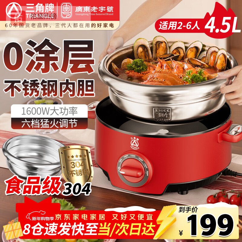 三角牌(Triangle)家用电火锅304不锈钢0涂层火锅专用锅4.5升大容量2-6人电煮锅多功能锅蒸煮打边炉涮肉锅CDR160(6)¥
