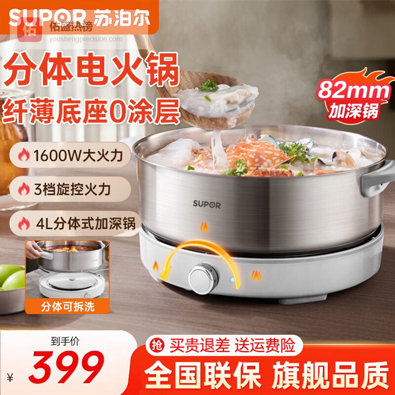 苏泊尔(SUPOR)0涂层不锈钢电火锅 超薄速沸电煮锅 火锅专用锅 家用多功能分体式电热锅涮肉多用途锅 4L /0涂层不锈钢/商场同款¥