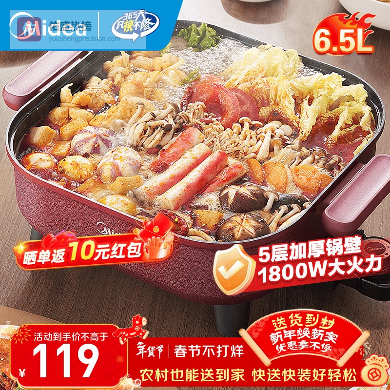美的(Midea)火锅电火锅 6L大容量火锅专用锅鸳鸯锅电煮锅煎烤涮肉多功能一体锅加深烤鱼锅电炒锅DY3030Easy102 6.5L 双耳大火锅 | 不粘易清洗¥