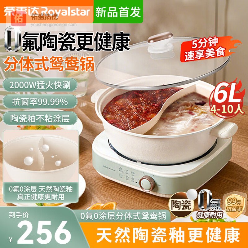 荣事达(Royalstar)电火锅 鸳鸯锅 电炒锅天然陶瓷釉锅6L家用大容量分体多功能锅 炒菜电煮锅涮肉锅3分钟速沸分区控温 6L 【天然陶瓷釉鸳鸯锅体+分体底座】2000W¥