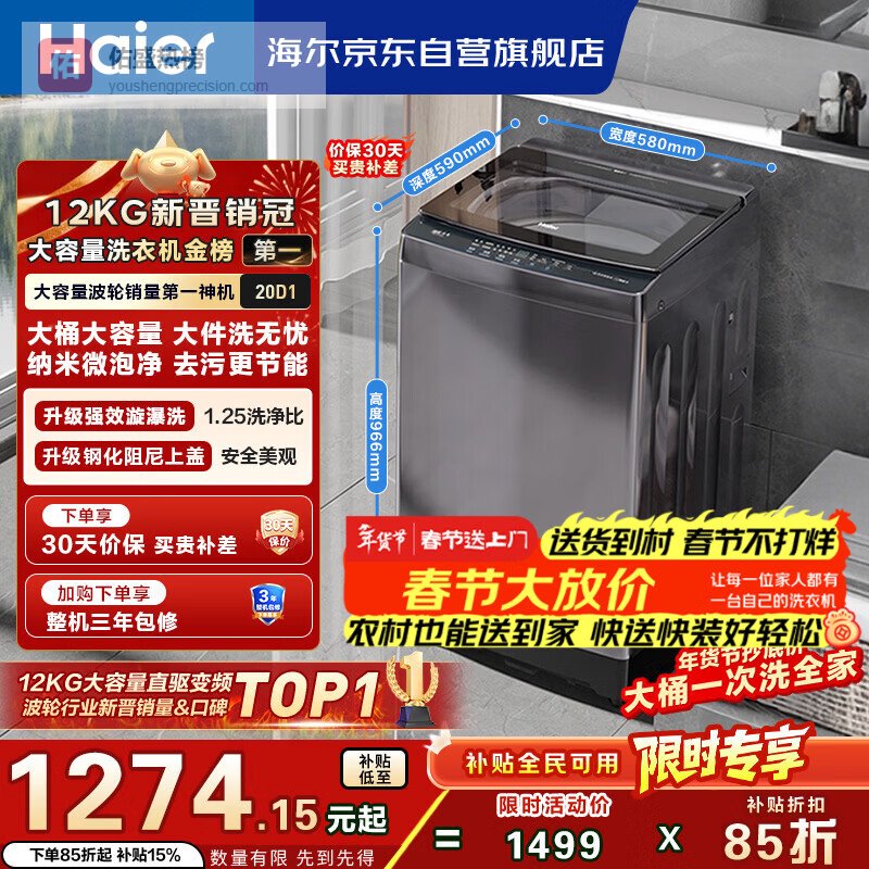 【京东自营】海尔全自动波轮洗衣机12KG大容量玻璃上盖家用家电国家补贴以旧换新XQB120-BZ20¥