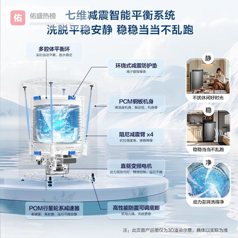 3️⃣七维减震智能平衡系统:结合精密的七维减震技术,能够在运转期间自动感应并调节平衡,实现静音操作。这一设计不仅提升了洗衣的效率,更能保证家庭生活的不被打扰,让洗衣过程轻松愉悦。