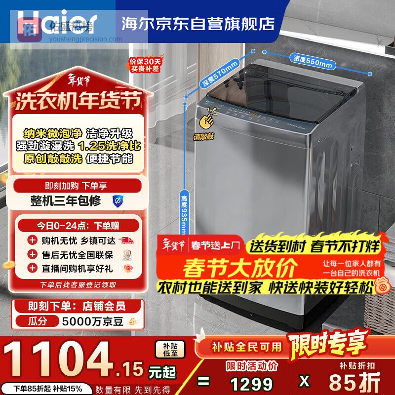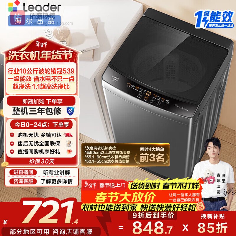 【京东自营】海尔全自动波轮洗衣机10KG超薄变频一级能效超薄家电国家补贴以旧换新京东自营XQB100¥