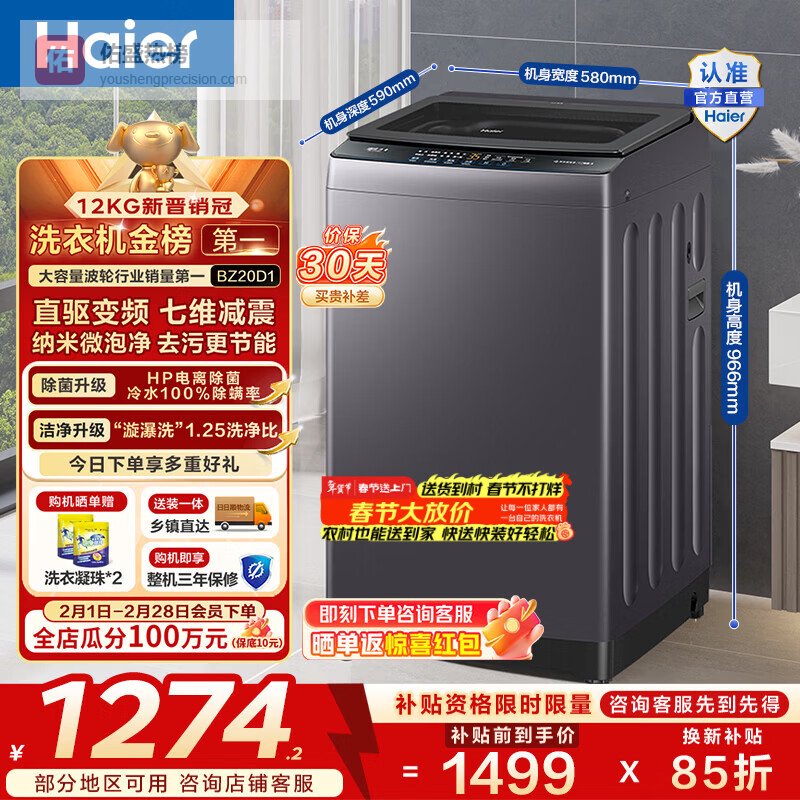 【品牌直营】海尔波轮洗衣机12公斤全自动懒人家用大容量直驱变频一级能效除菌漩瀑洗1.25洗净比BZ2¥