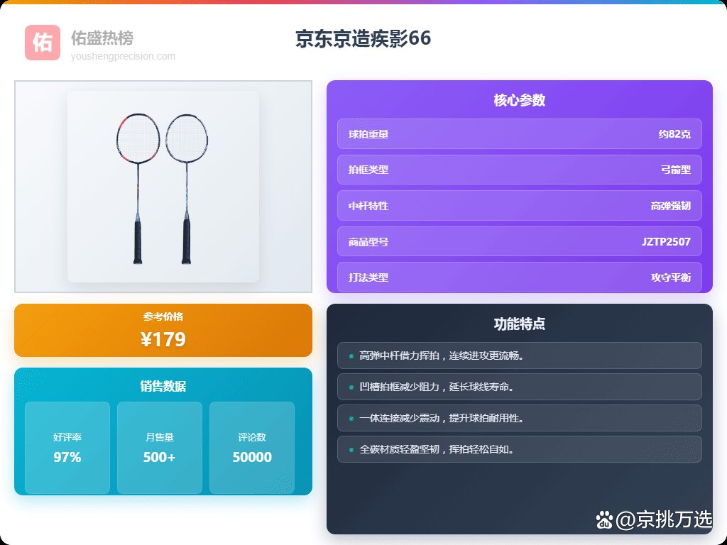 三、京东京造1️⃣ 轻盈材质:这款羽毛球拍用的全碳素材质,轻便又坚韧,拿起来特别顺手,长时间打也不会觉得累。重量大概82克,属于4U级别,既不会太重也不至于太轻,打起球来感觉刚刚好,能灵活应对各种动作。