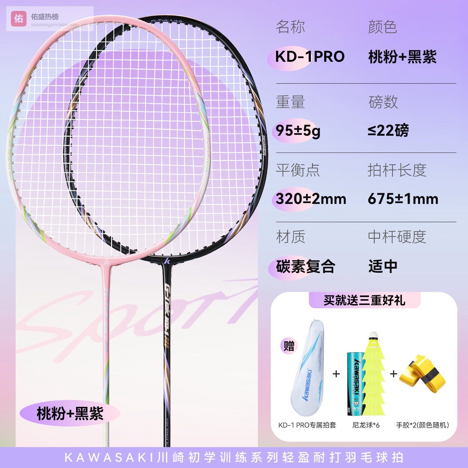 川崎(KAWASAKI)羽毛球拍超轻碳素中杆对拍KD-1pro黑紫+桃粉已穿线+6球+手胶+拍包¥
