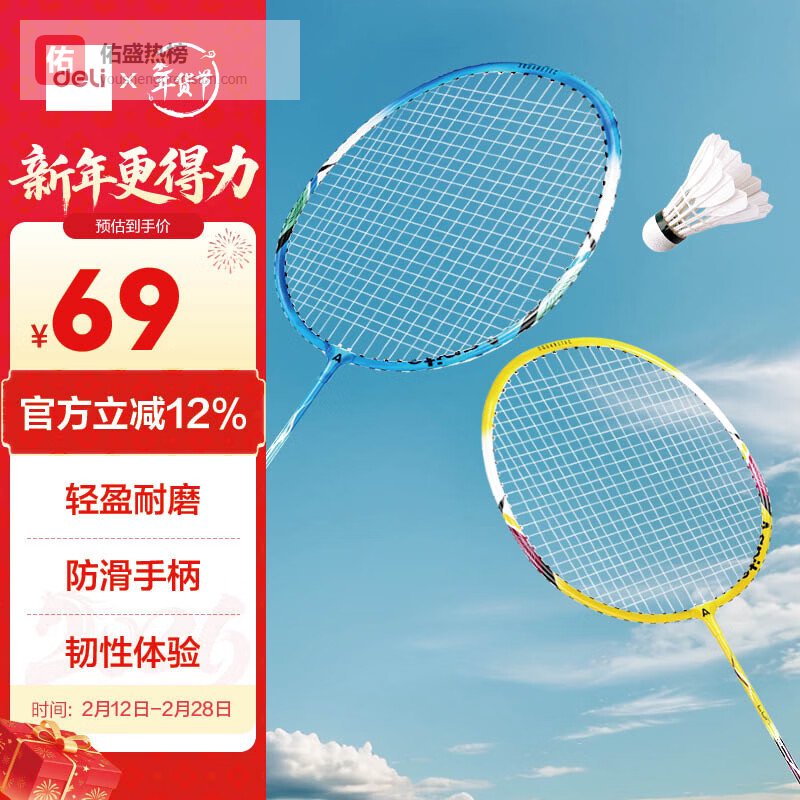 得力(deli) 成人羽毛球拍套装运动训练轻巧耐磨铝合金男女对拍 送三球¥