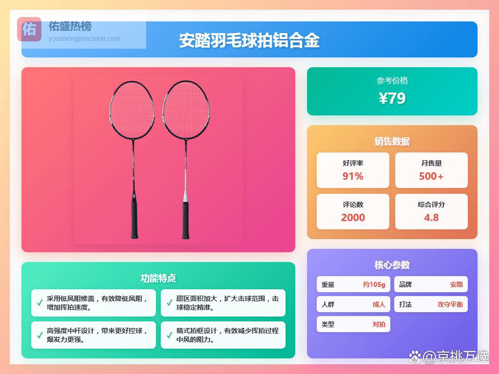 四、安踏1️⃣ 坚固耐用:这款安踏羽毛球拍采用了高强度的铝合金材质,拍框超级结实耐撞击,不容易变形或断裂,能陪你打很久。不用担心运动中磕到墙壁或偶尔碰撞,拍子还能保持良好的状态,真挺放心的。