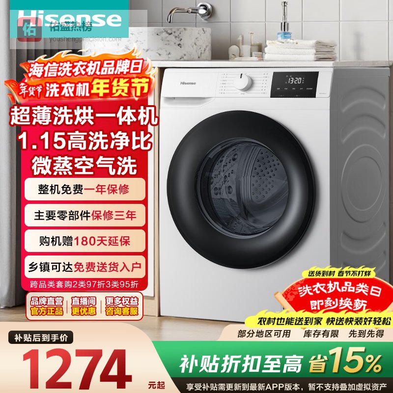 【品牌直营】海信9kg滚筒洗烘一体机超薄嵌入全自动家用1.15高洗净比一级能效WD90A1Q-5以旧¥