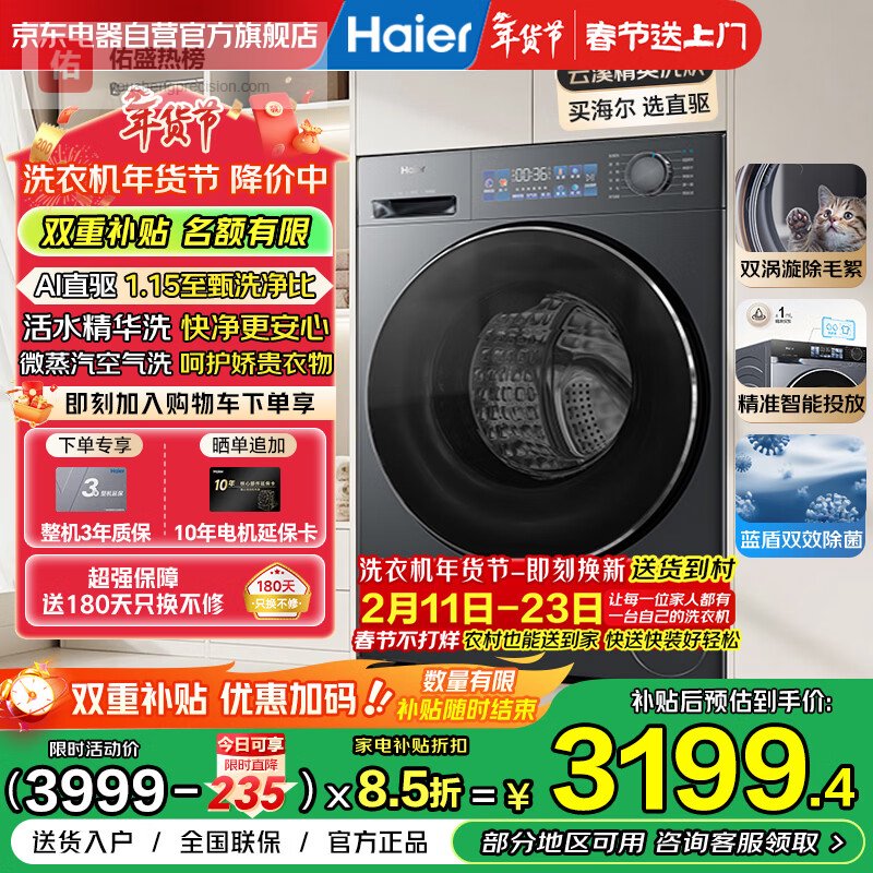 【京东自营】海尔云溪精英版滚筒洗衣机全自动带烘干洗烘一体机10公斤家用直驱精华洗国家补贴XQG100¥