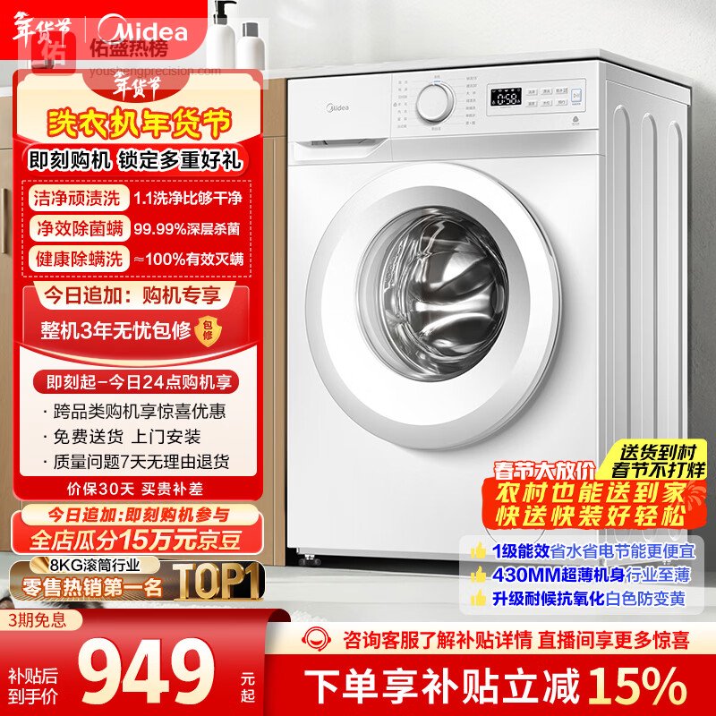 【京东自营】美的滚筒洗衣机全自动8公斤家用超薄小型租房用巴氏除菌MG80V01JPY以旧换新国家补贴¥