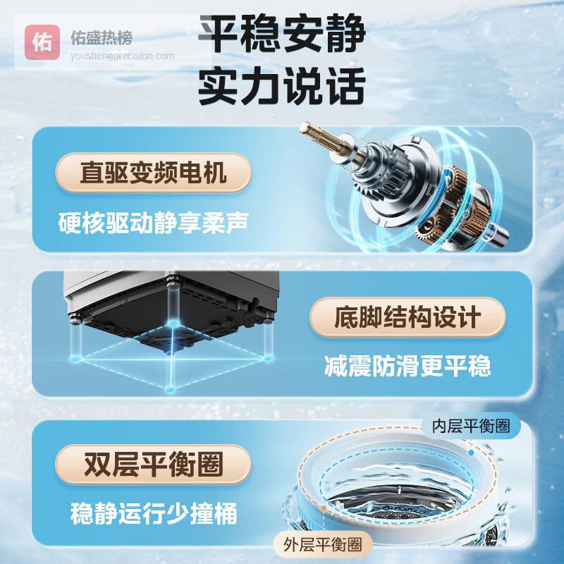 1️⃣高效直驱变频电机:强劲动力与低噪音的完美结合,带来安静舒适的洗涤体验。即使在夜间使用,也能保持低干扰,让家里保持宁静。