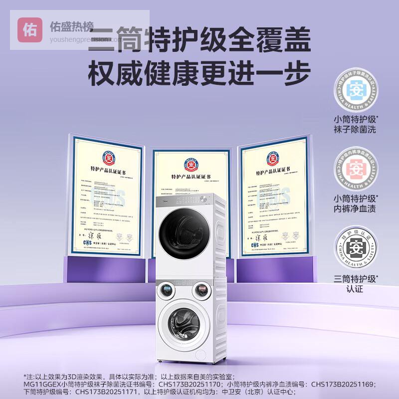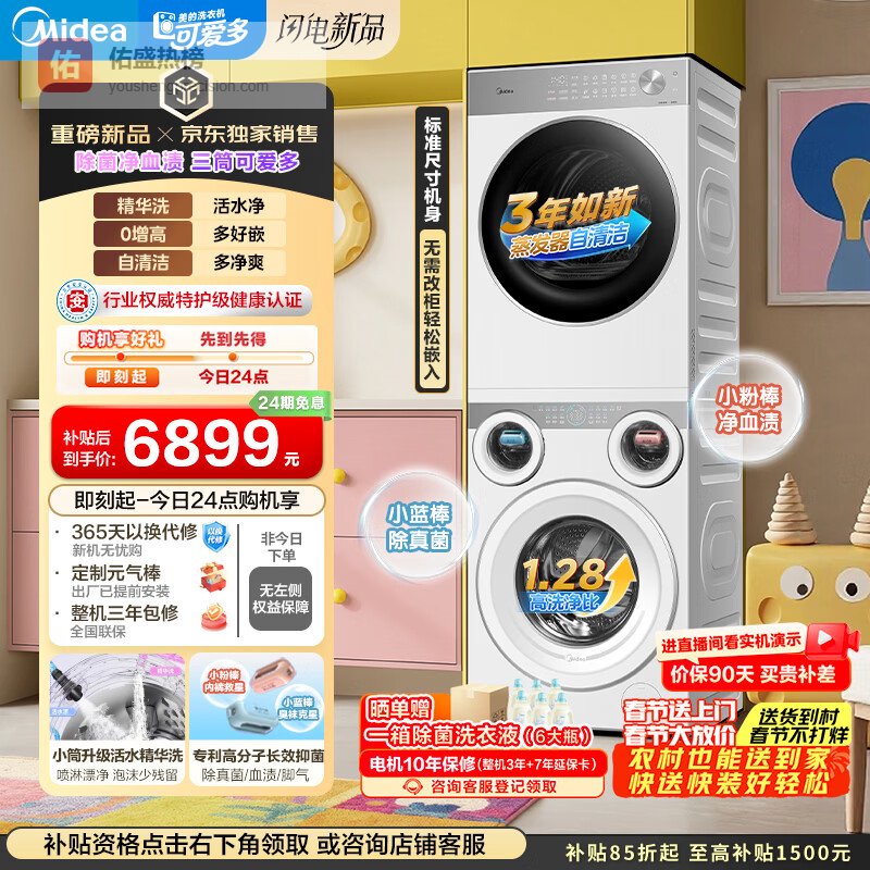 【京东自营】美的可爱多分区洗烘套装11KG三筒滚筒洗衣机全自动+10KG热泵烘干机MG11GGEX+¥