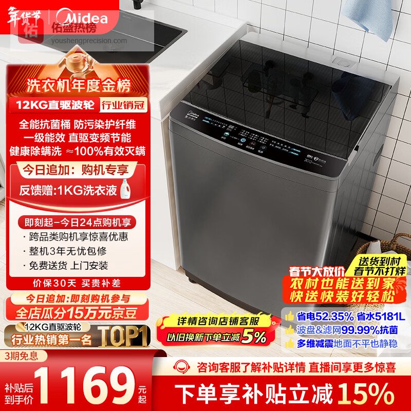 【京东自营】美的随心洗波轮洗衣机全自动12公斤大容量直驱变频专利免清洗MB120L3D以旧换新国家补¥