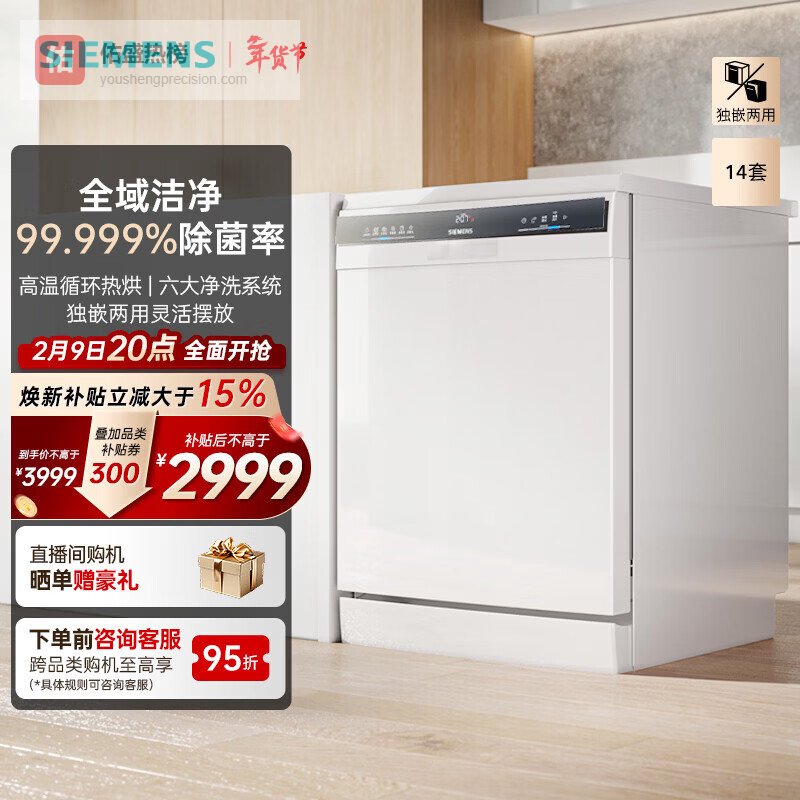 【品牌直营】西门子【晶洗舱】独嵌两用家用全自动智能洗碗机14套150升以上超大容积高温循环热烘99.¥