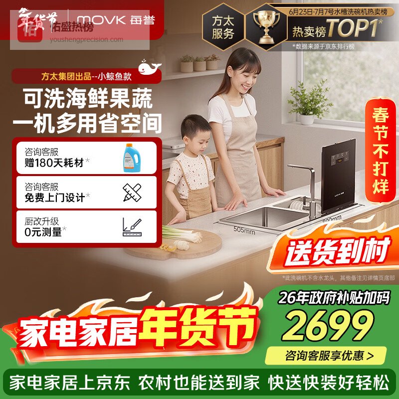 【京东自营】每誉水槽式一体机洗碗机嵌入式一级水效美誉洗海鲜果蔬小鲸鱼新一代方太集团出品JPSD2T-¥