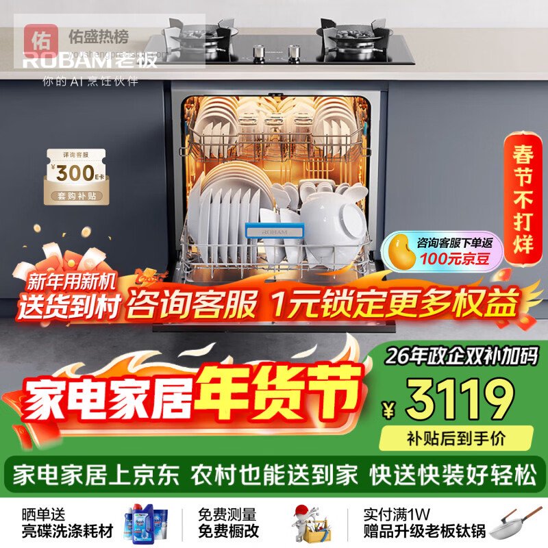 【京东自营】老板【灶下独立紫外消毒】B60D106升大容量洗碗机嵌入式家用全自动热风烘干一级水效0菌¥