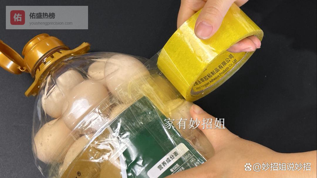 将整个油桶里面都装满了鸡蛋后,我们再把掰开的标签纸位置给它盖下来,然后用透明胶布把刚刚割开的位置封起来,尽量给它多粘上一些胶布,避免不牢固、散开了。