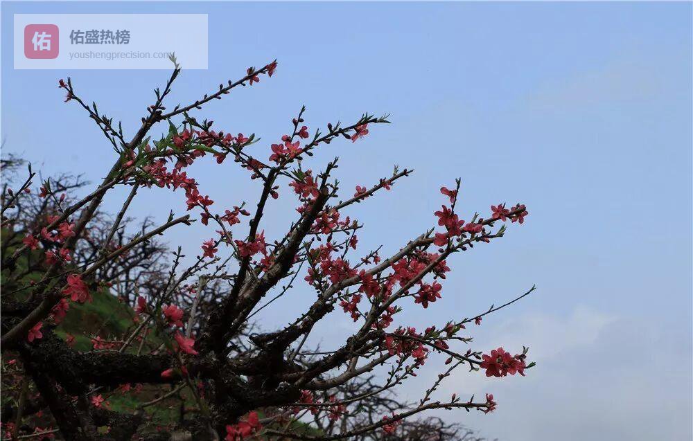 桃园地形呈天然斜坡,站在高处俯瞰,翠绿底色里猛然跳出绚烂绯红,像给山体系上一条斑斓丝带。树干深褐皲裂,叶片尚未完全舒展,却已冒出嫩绿芽尖——老树与新花同框,岁月与生机并置,正是自然最动人的辩证法。