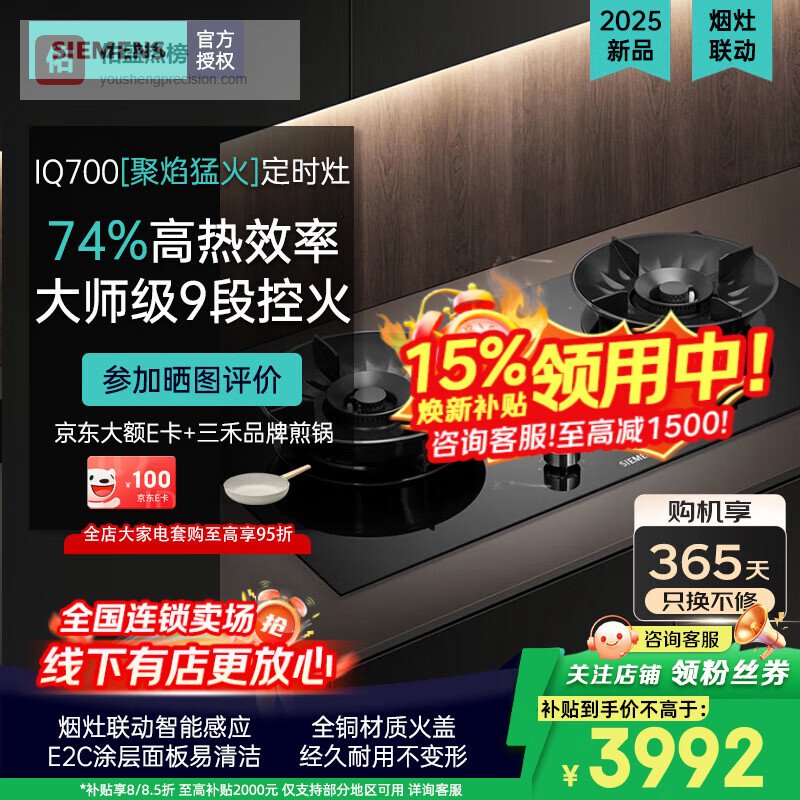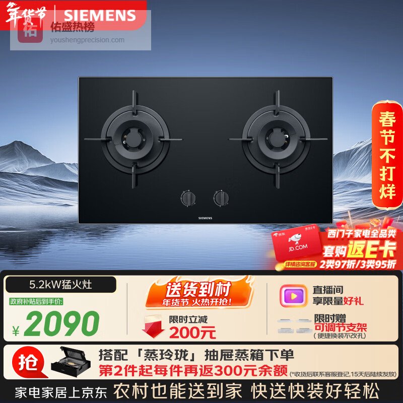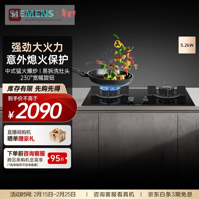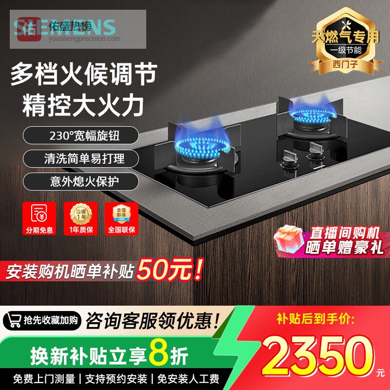 【品牌直营】西门子5.2kW聚焰大火力嵌入式燃气灶家用双眼定时灶具9段控火意外熄火保护智能烟灶联动E¥
