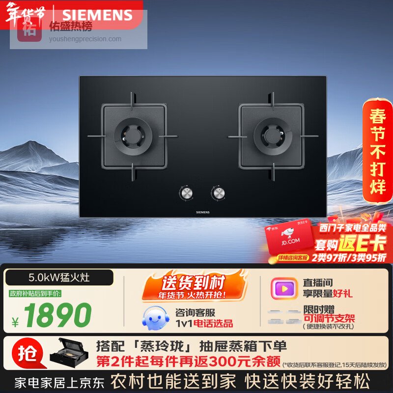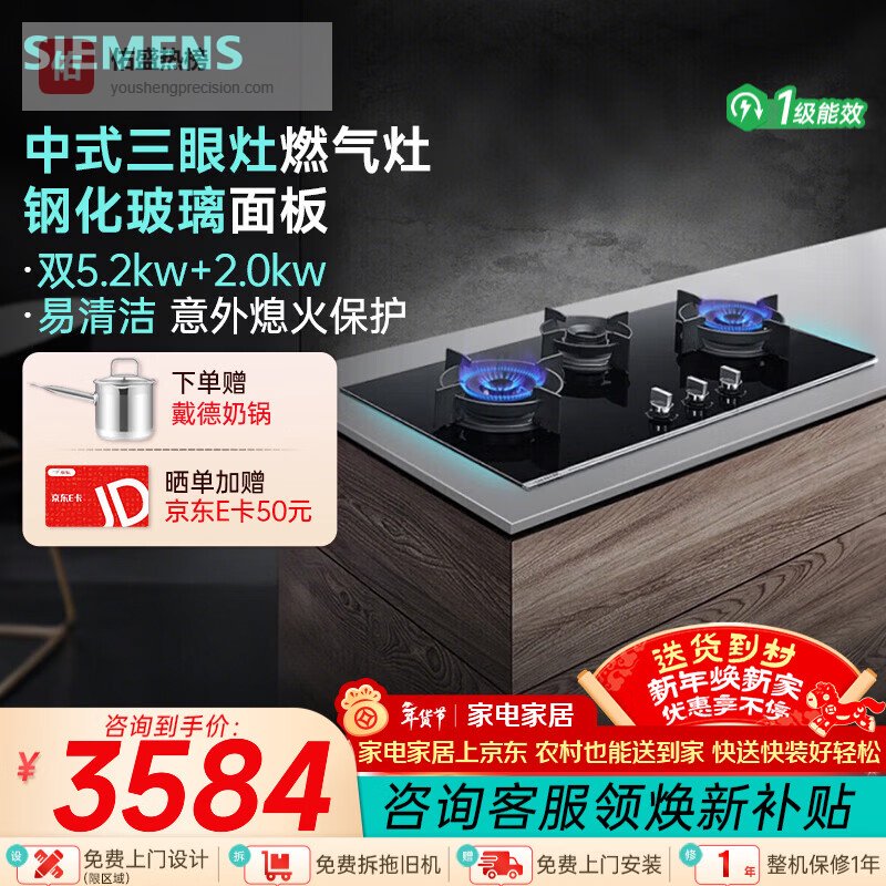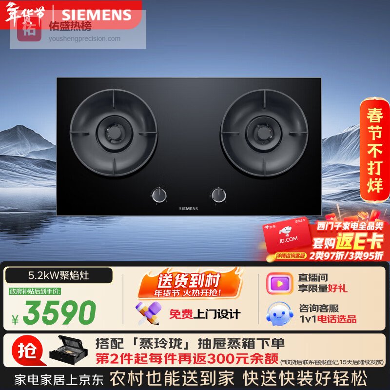 【京东自营】西门子【德系精工】5.2kw燃气灶双灶天然气灶猛火大火力台嵌两用家用一级能效可组套装ER¥