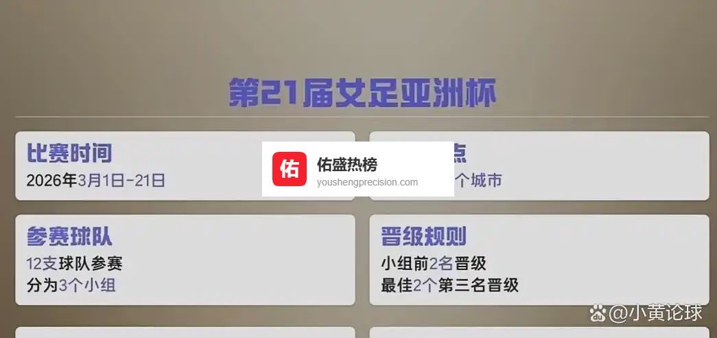 2026年3月1日至21日,第21届女足亚洲杯将在澳大利亚悉尼、珀斯和黄金海岸三座城市打响。 作为亚洲女足的最高舞台,本届赛事汇聚了12支顶尖球队,其中东道主澳大利亚与中国、日本、韩国直接晋级,其余8支队伍通过预选赛厮杀脱颖而出。