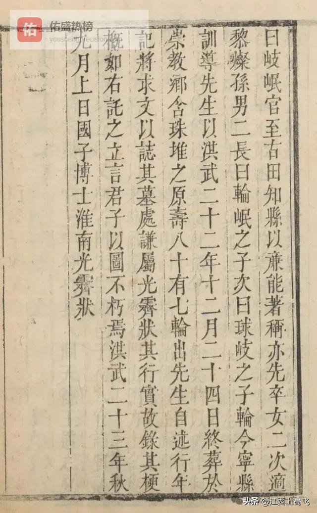 先生以洪武二十二年十二月二十四日终,葬于崇教乡含珠堆之原,寿八十有七。轮出先生自述《行年记》,将求文以志其墓。处谦属光霁状其行实,故录其梗概如右,托之立言君子,以图不朽焉。