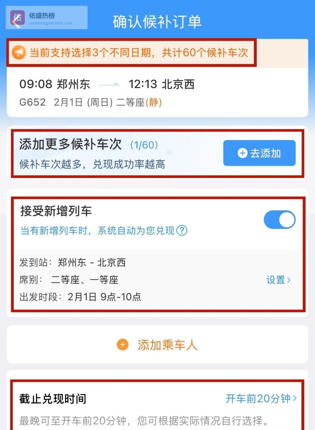 官方给每位旅客最多6个待兑现候补订单,每个订单可同时追踪3个乘车日期、最多60个“日期+车次”组合。