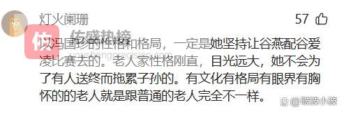 就在双方吵得不可开交的时候,一条热评直接被顶到了榜首。这条热评一句话戳中要害,瞬间引发全网共鸣,扭转了不少人的看法。以冯国珍的性格和格局,一定是她坚持让谷燕陪谷爱凌比赛去的。老人家性格刚直,目光远大,她不会为了有人送终而拖累子孙的。有文化有格局有眼界有胸怀的老人就是跟普通的老人完全不一样。
