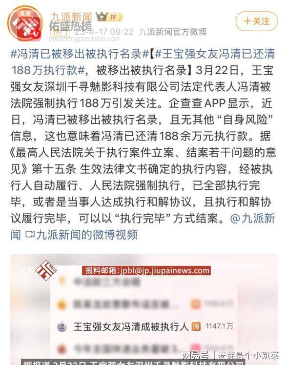 但2023年3月,一条关于冯清的消息让这段感情重新引发了外界关注——冯清名下的公司被强制执行188万余元的债务。